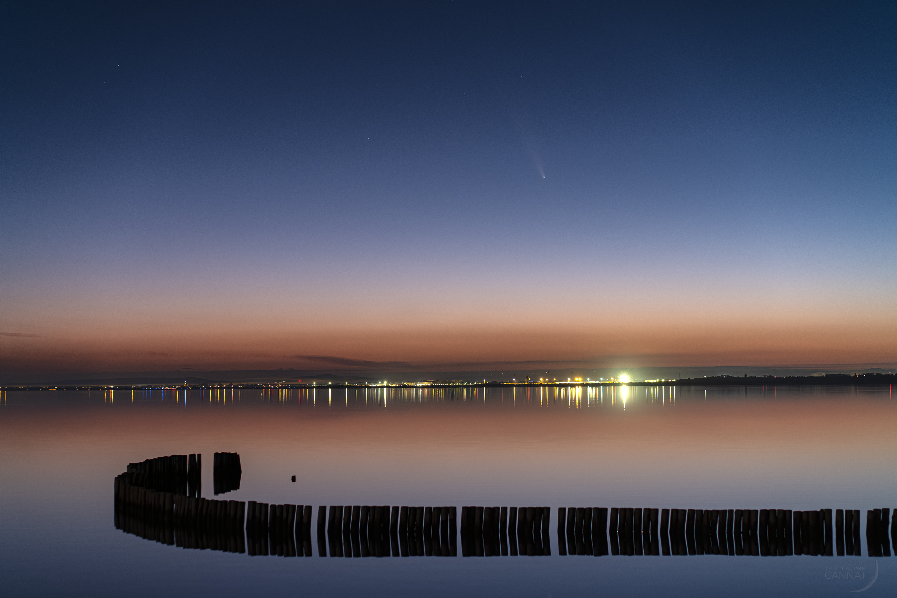 La comète C/2023 A3 Tsuchinshan-ATLAS au-dessus de l’étang de l’Or, à côté de Montpelier, le 13 octobre au crépuscule ; objectif de 55 mm.
