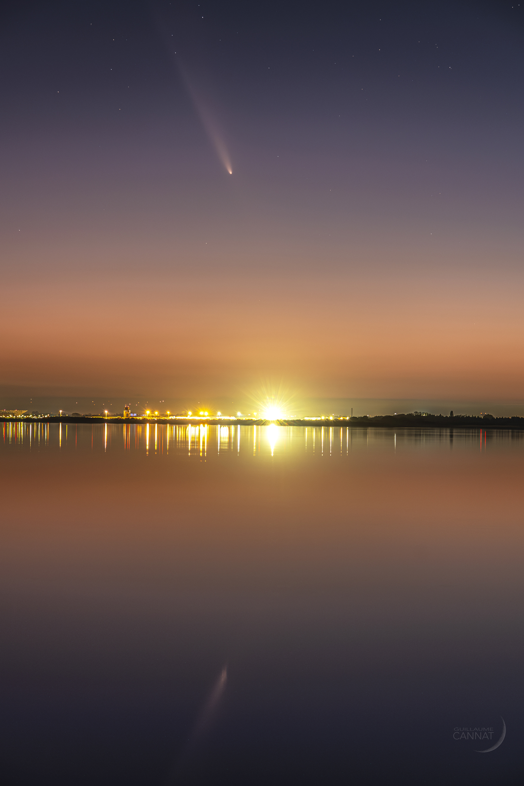 La comète C/2023 A3 Tsuchinshan-ATLAS au-dessus de la pollution lumineuse de l’aéroport de Montpellier Méditerranée avec son reflet dans l’étang de l’Or, le 13 octobre à la fin du crépuscule ; objectif de 85 mm.