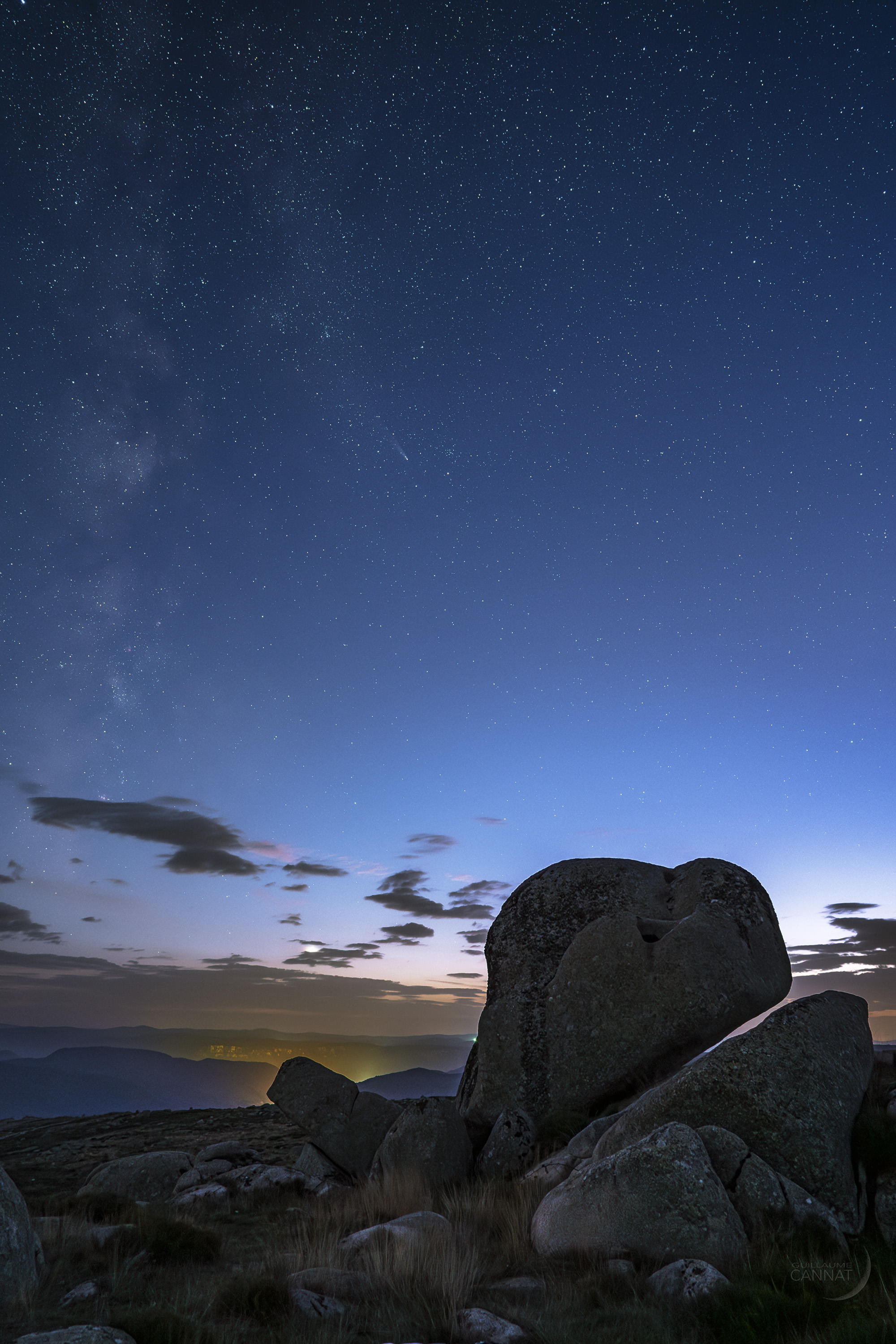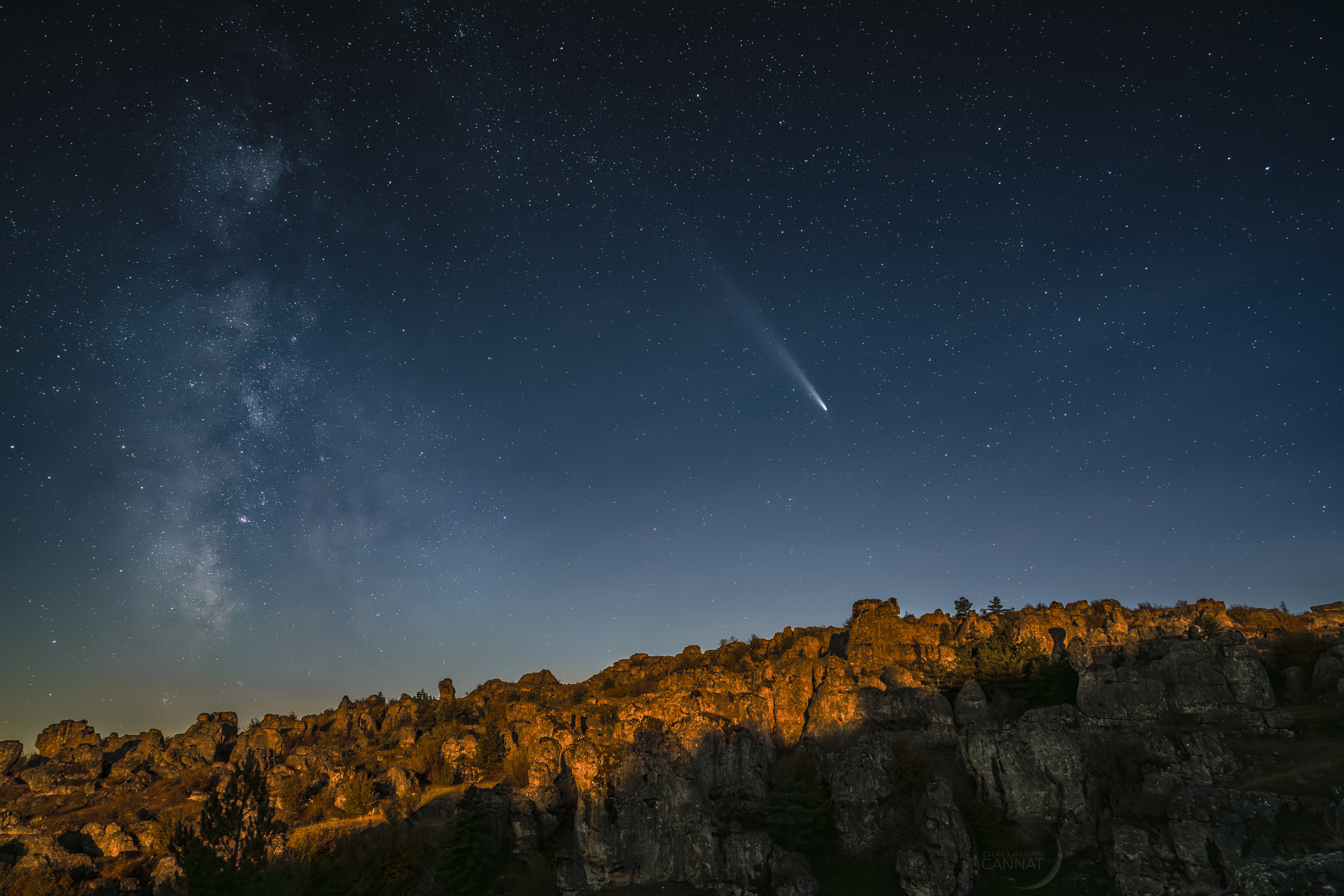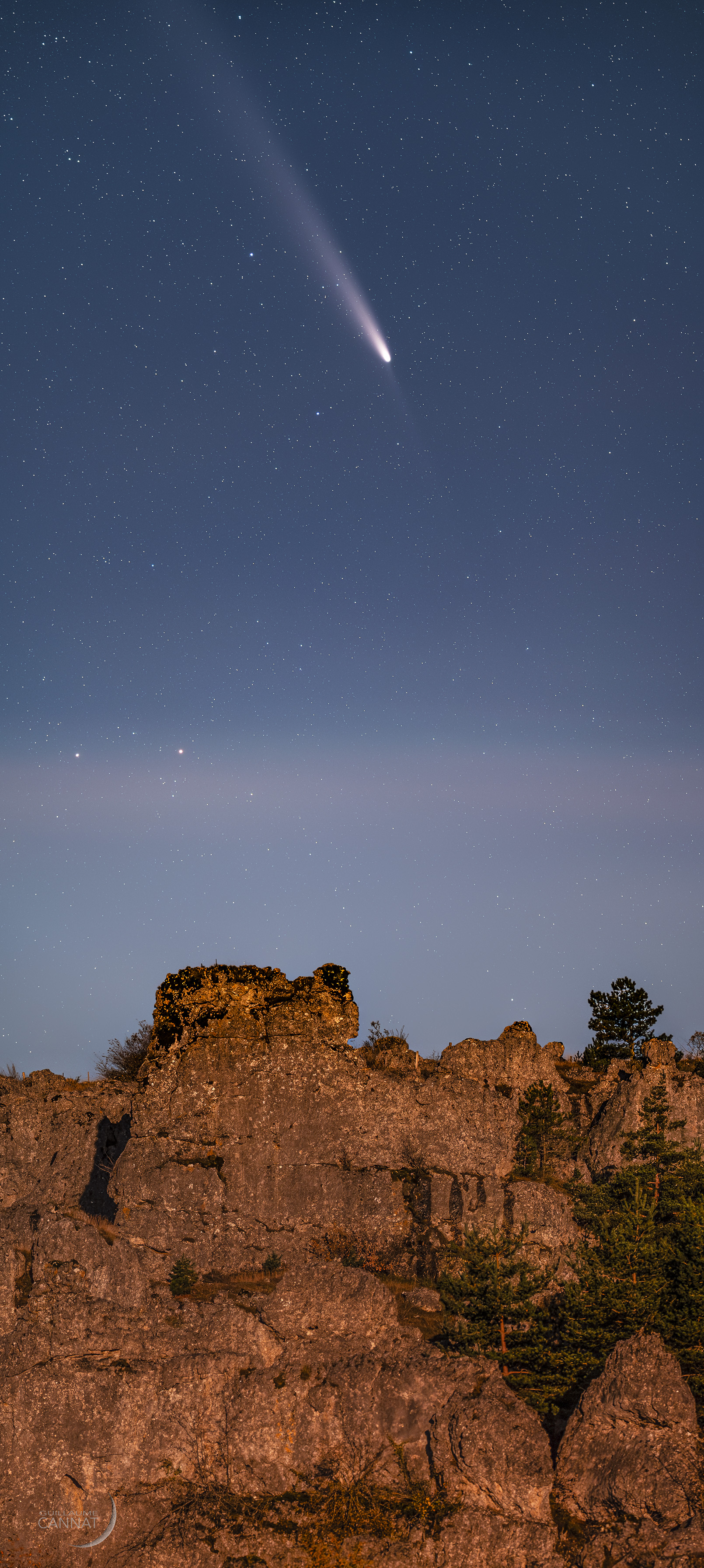 La comète C/2023 A3 Tsuchinshan-ATLAS au-dessus du chaos rocheux de Nîmes-le-Vieux éclairé par le lever de la Lune, le 19 octobre à la fin du crépuscule ; objectif de 24 mm.