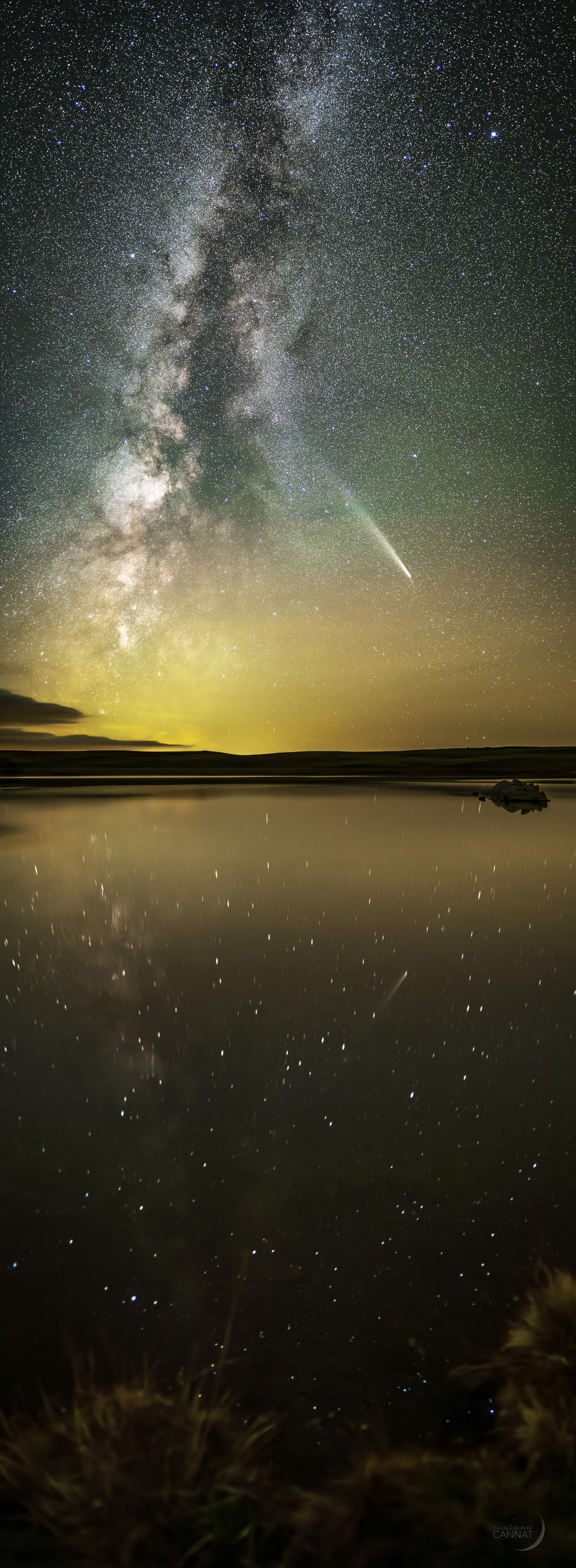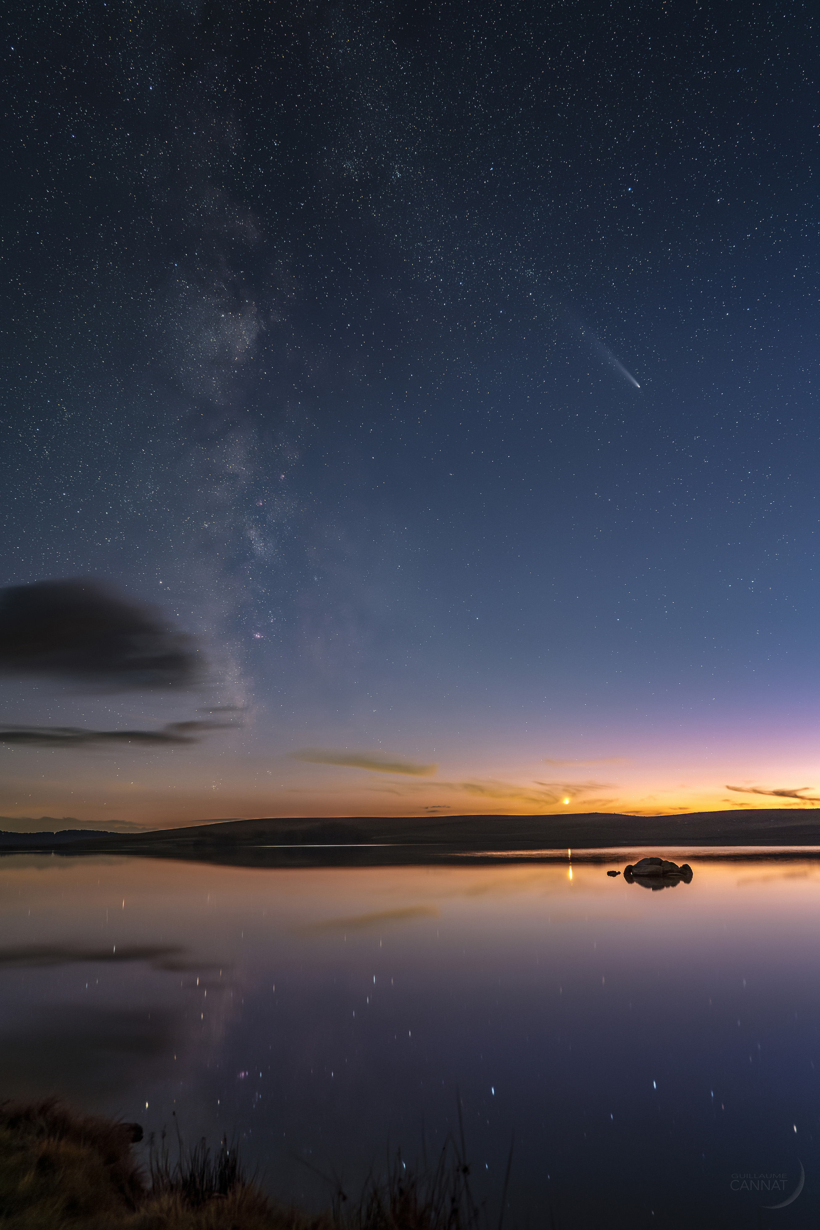 La comète C/2023 A3 Tsuchinshan-ATLAS avec Vénus et la Voie lactée au-dessus du lac des Moines (Aubrac), le 23 octobre au crépuscule ; objectif de 24 mm.