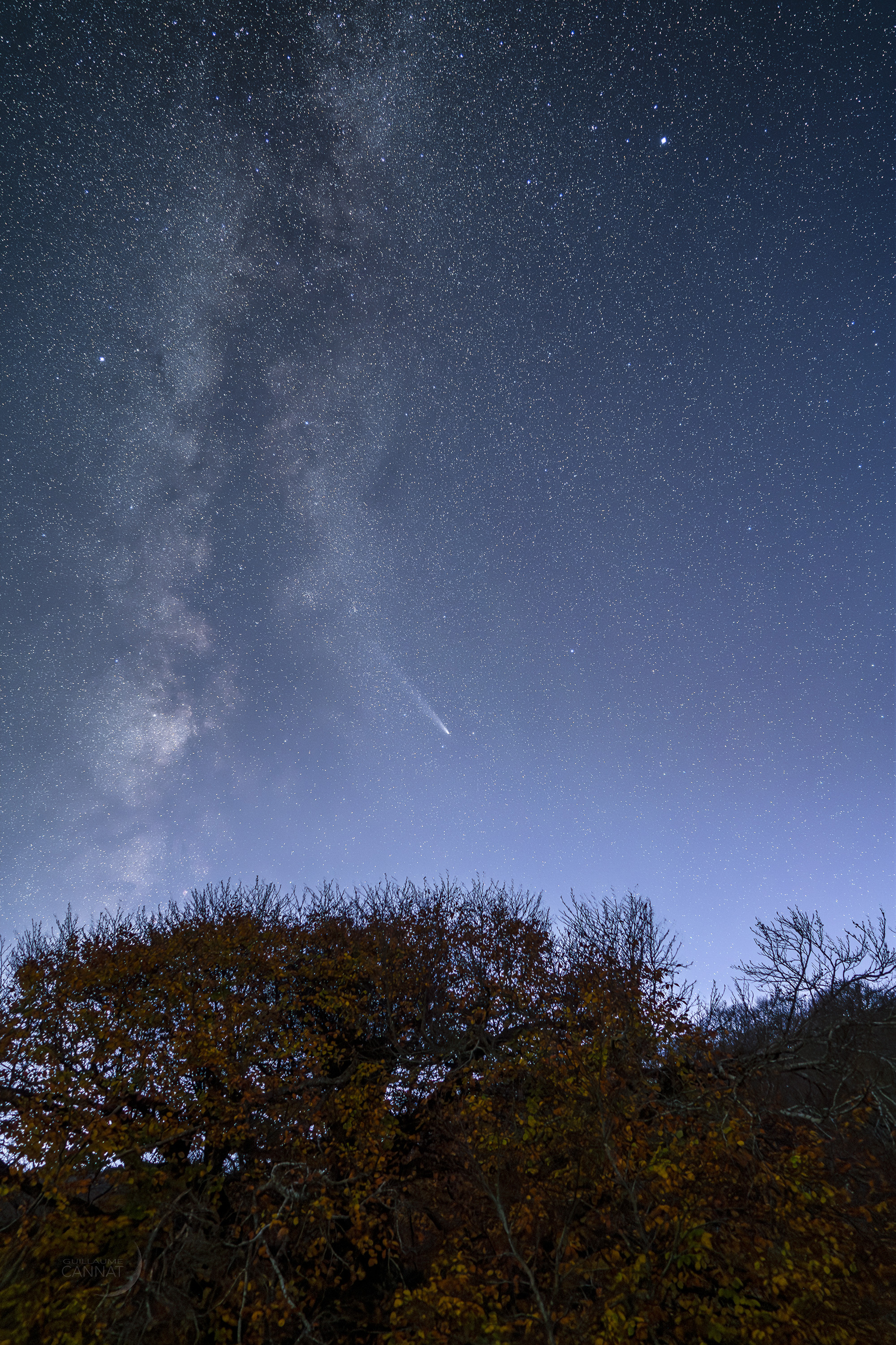 La comète C/2023 A3 Tsuchinshan-ATLAS depuis la terrasse de l’observatoire astronomique des Pises (Réserve internationale de ciel étoilé du parc national des Cévennes), le 29 octobre au crépuscule ; objectif de 24 mm.