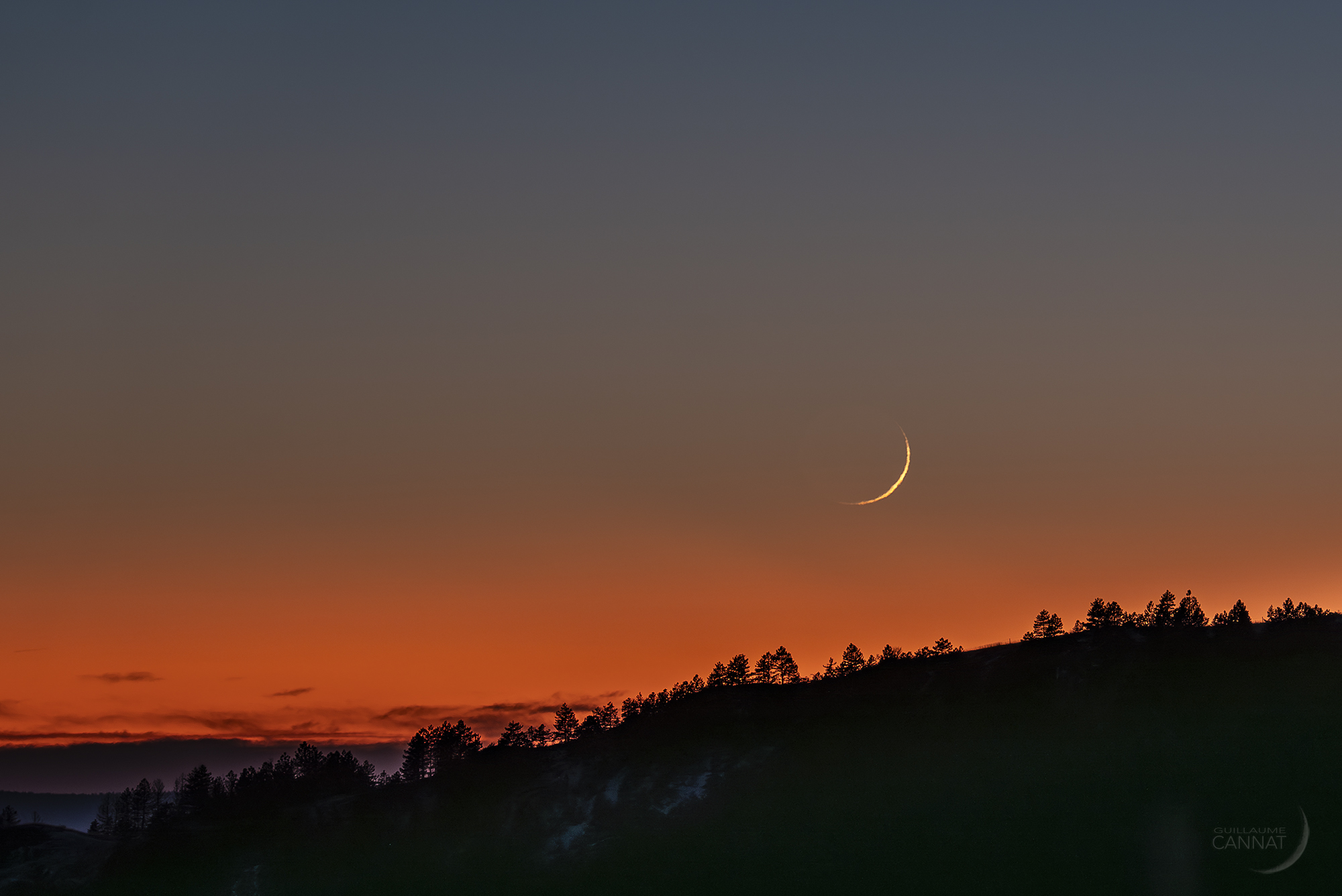 Le jeune croissant lunaire avec une lumière cendrée à peine perceptible se couche sur l’échine d’Aze, flanc sud-ouest du mont Lozère.