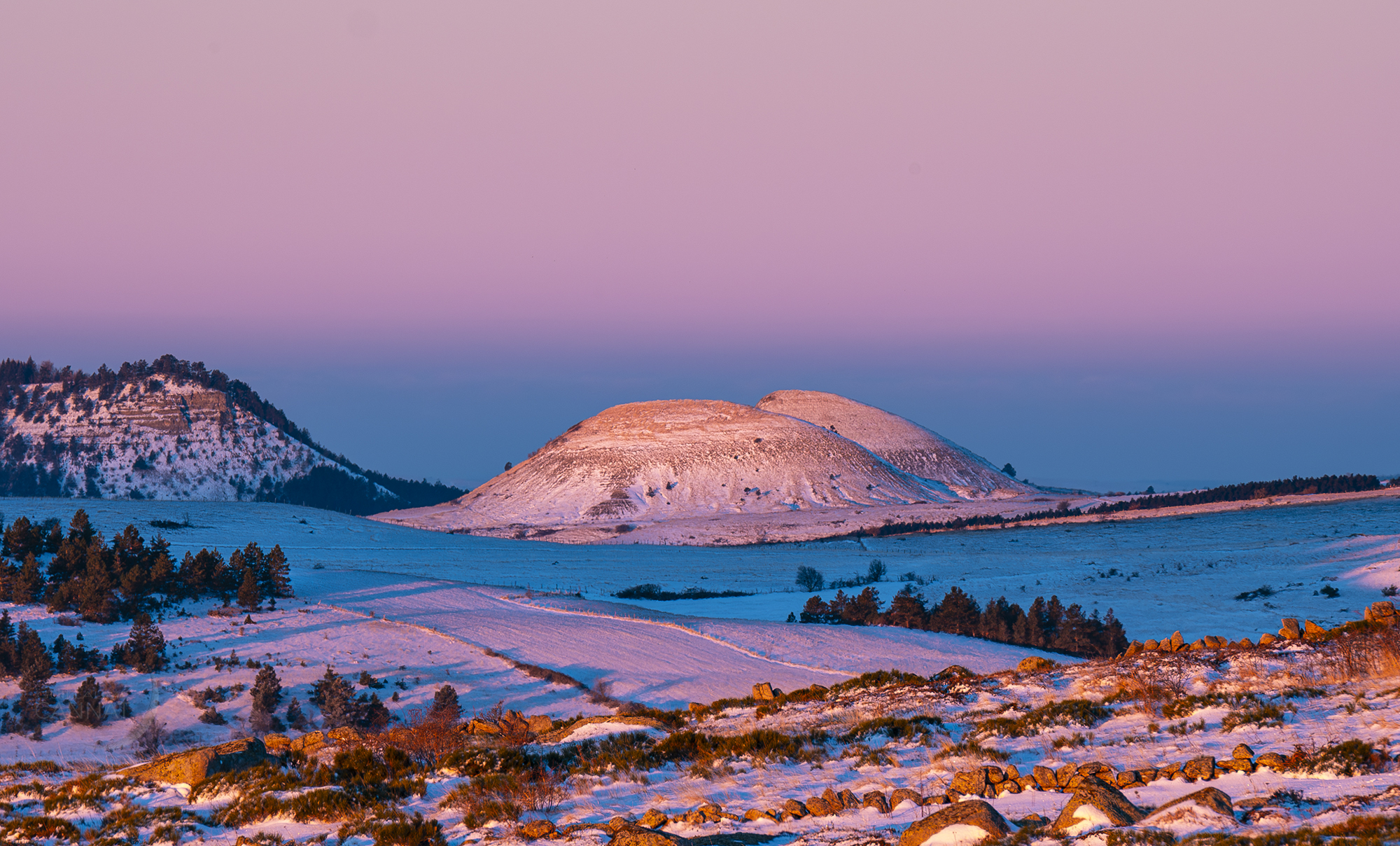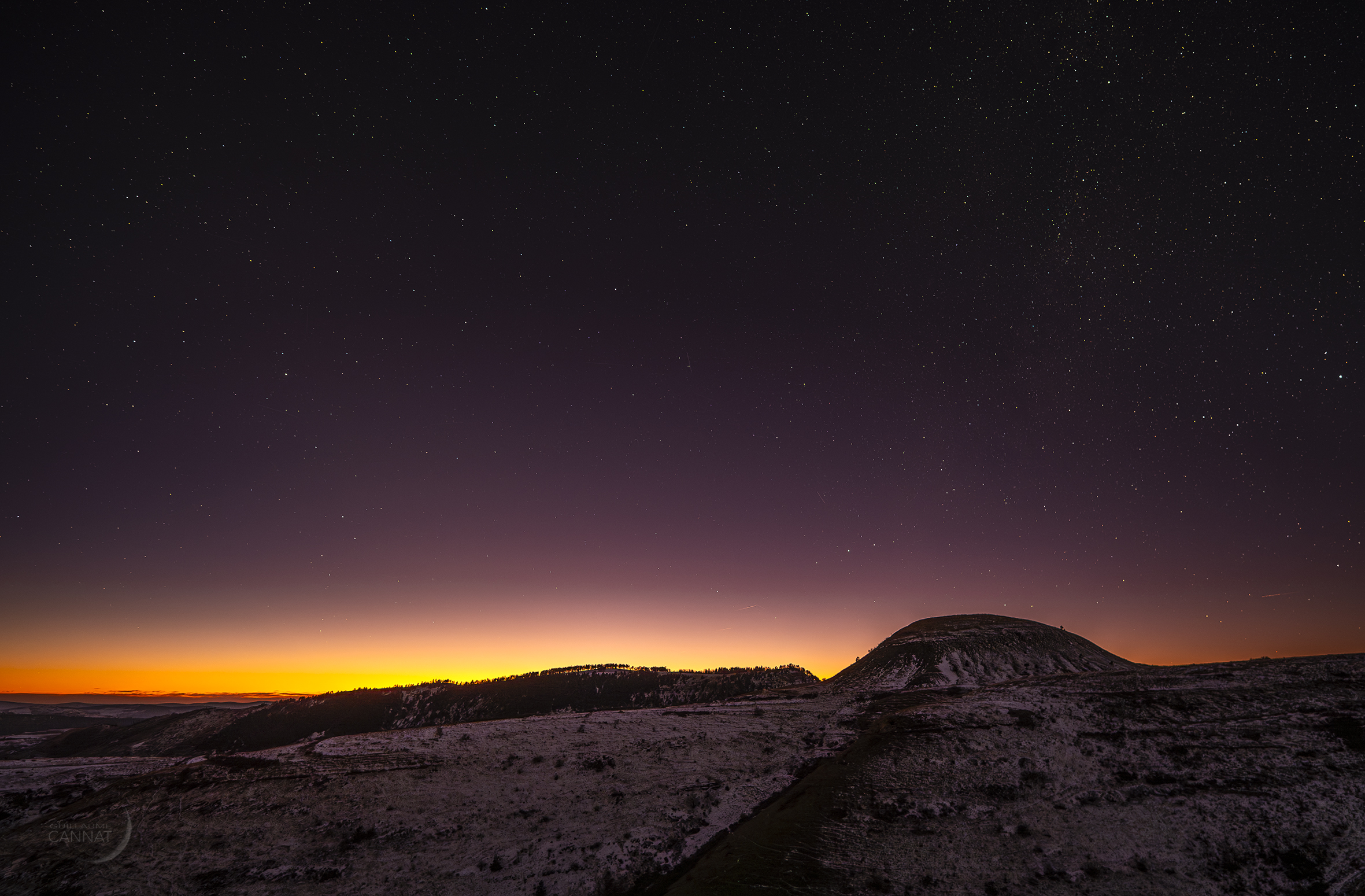 Quelques minutes avant le lever du Soleil, les Puechs des Bondons se découpent devant l’ombre de la Terre surmontée par la lueur rosée de la ceinture de Vénus.