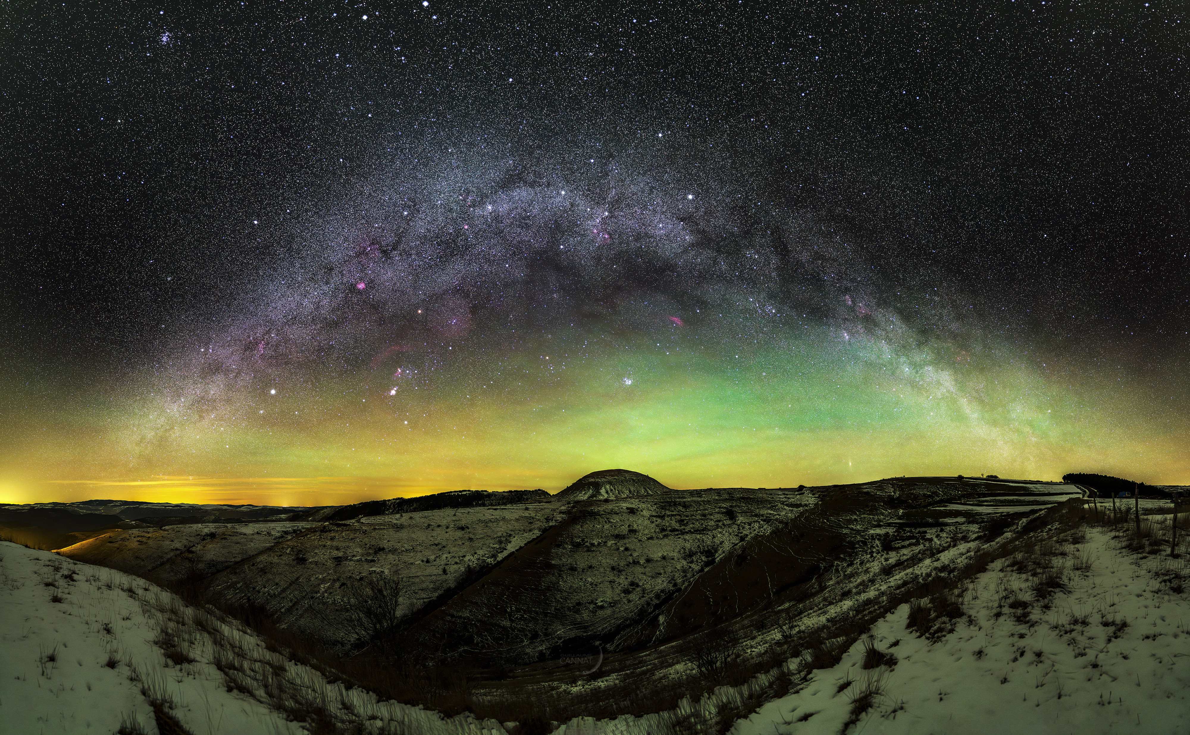 L’arche galactique, du Grand Chien au sud à Cassiopée au nord, se déploie comme une vague écumeuse au-dessus des Puechs des Bondons, et, à l’horizon, quelques cirrus amplifient les halos de pollution lumineuse de villes lointaines. Technique : boîtier Sony A7III défiltré avec un objectif Sony GM de 24 mm diaphragmé à 2 ; panorama de huit champs, pose de 120 secondes par champ (20 fois 6 secondes sans entraînement) à 8 000 ISO.