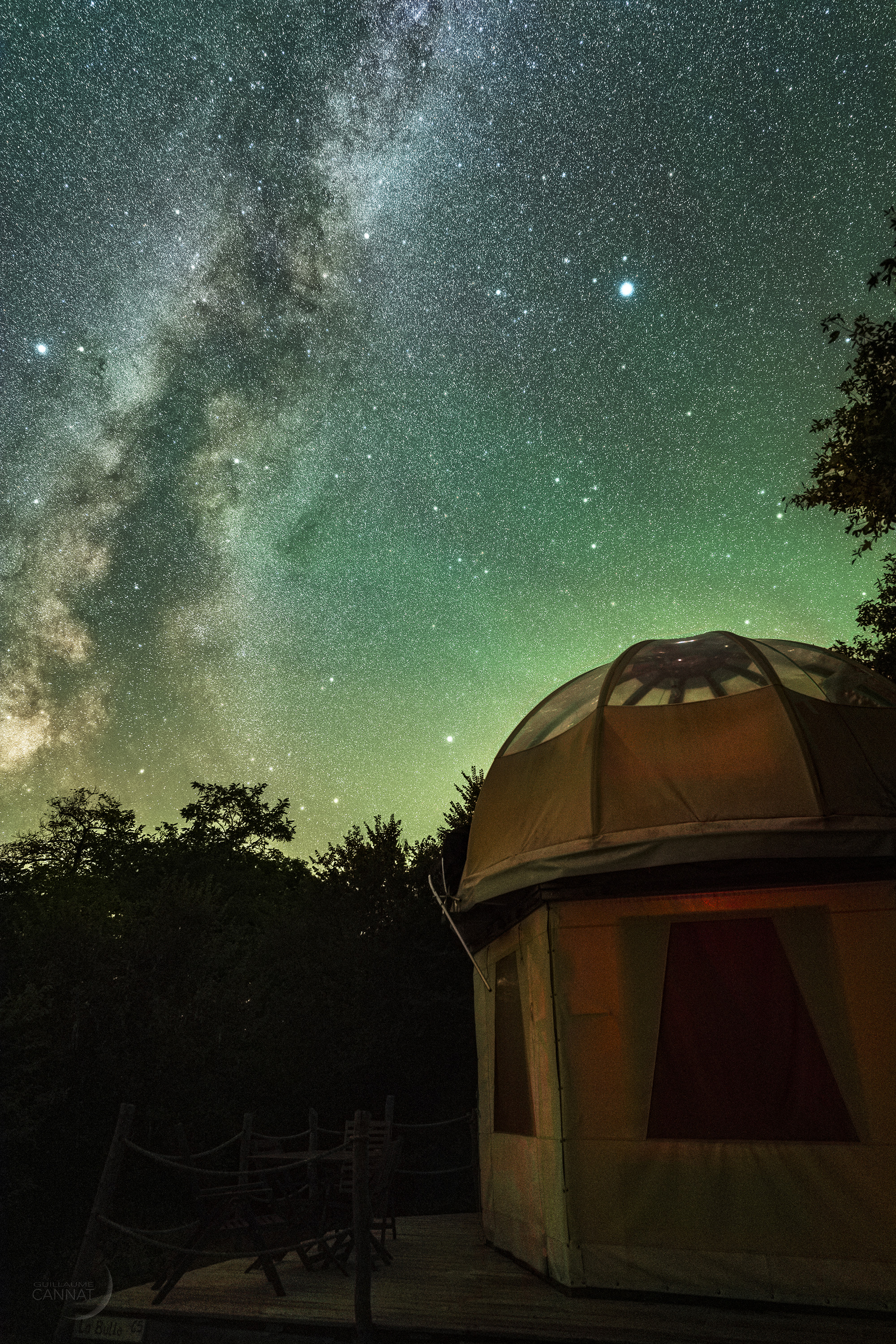 La Voie lactée et l’airglow envahissent la voûte céleste au-dessus de la bulle du domaine de Pradines.