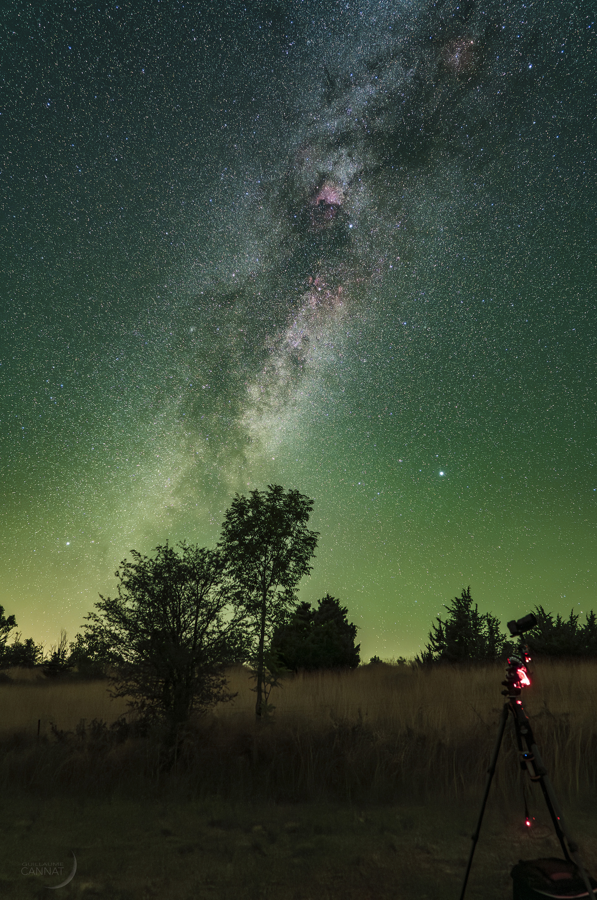 À la fin d’une nuit aoûtienne sur le causse Noir (Réserve internationale de ciel étoilé du parc national des Cévennes), Altaïr, Véga et Deneb entraînent le Triangle d’été tacheté de nébuleuses vers l’horizon ouest et mon second boîtier accumule des images du ciel profond en attendant l’aube. La lumière du ciel nocturne (airglow) a grisé le fond du ciel toute la nuit et a laissé son empreinte vert émeraude sur mes photographies. Technique : boîtier Sony A7III défiltré avec un objectif Sony GM de 24 mm diaphragmé à 3,2 ; 6 minutes de poses sans entraînement (45 fois 8 secondes) à 8 000 ISO. Addition des images avec Starry Landscape Stacker et développement avec Lightroom.
