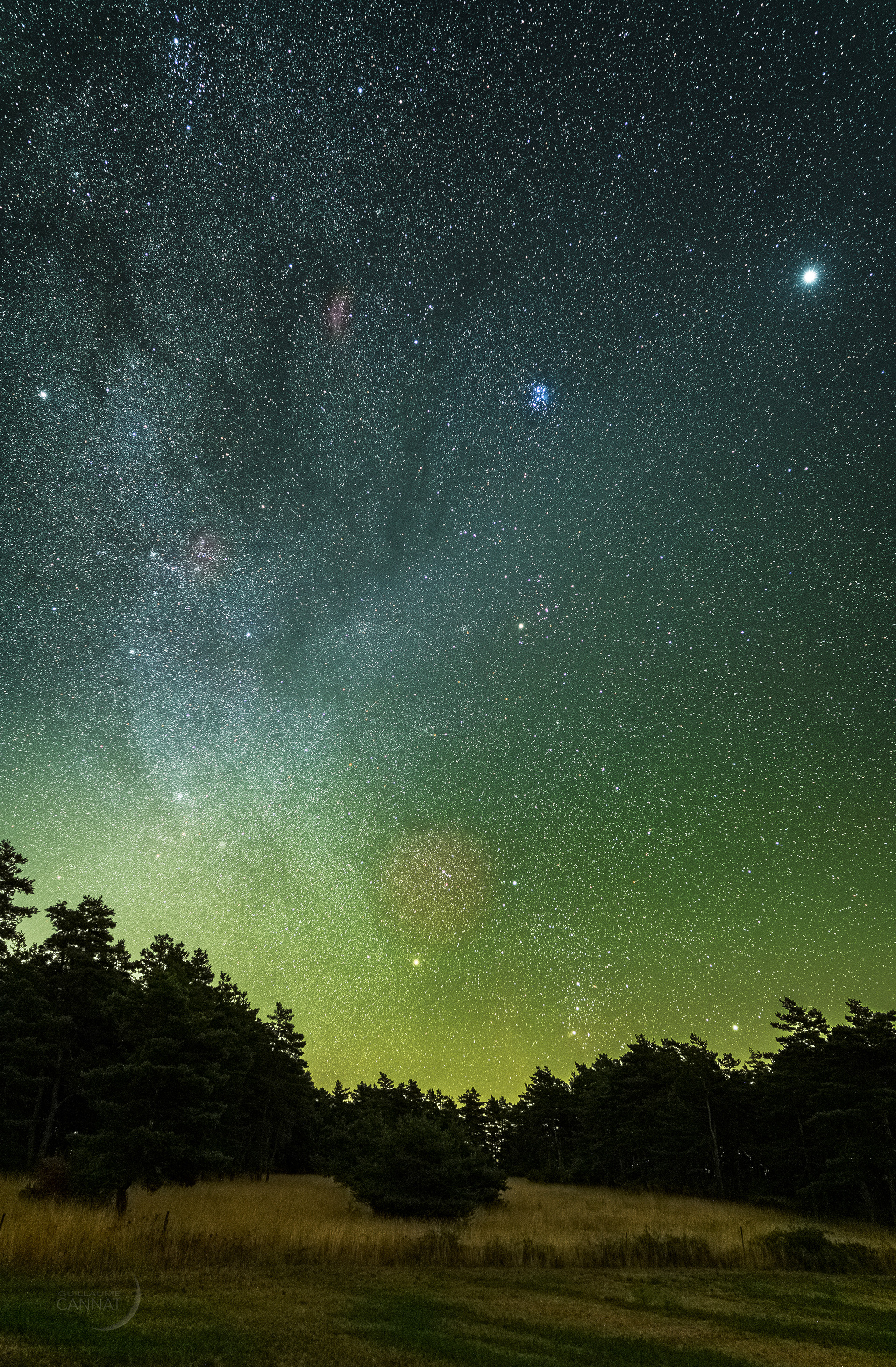 Le ciel d’hiver s’annonce à la fin d’une superbe nuit aoûtienne balayée par les vagues couleur d’émeraude de la lumière du ciel nocturne.