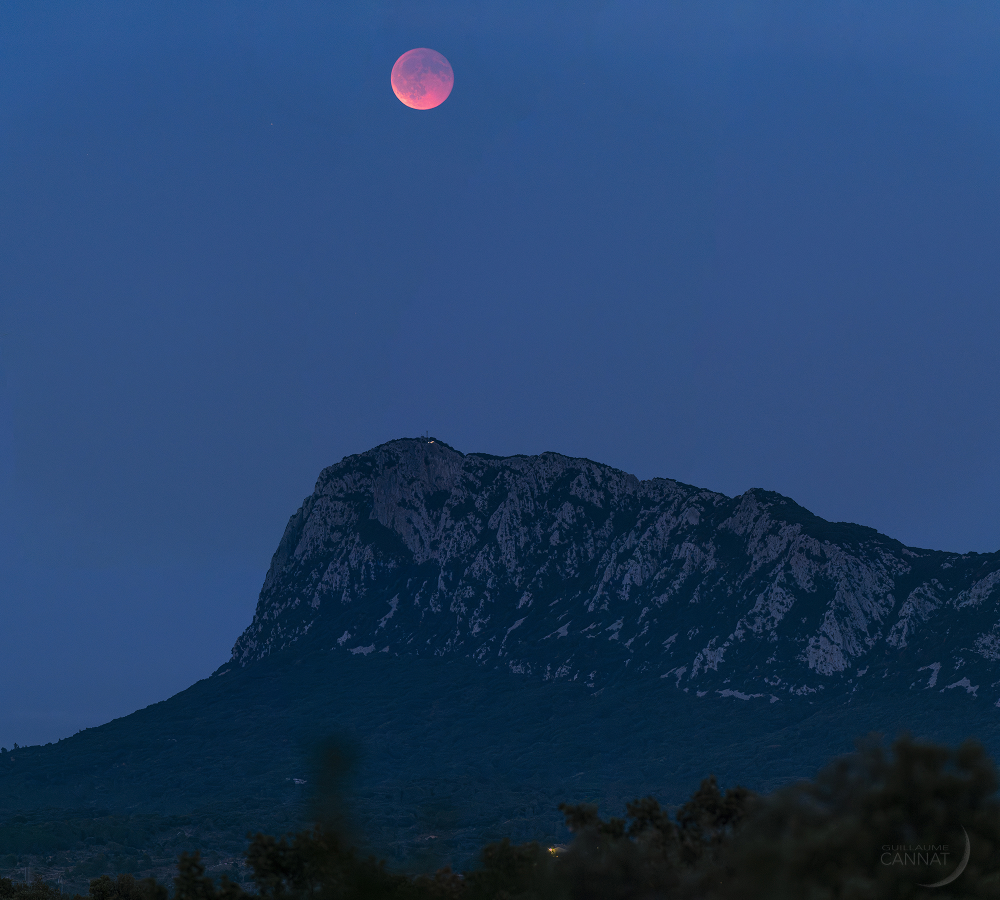 L’éclipse totale de Lune du dimanche 7 septembre 2025 au-dessus du pic Saint-Loup, dans l’arrière-pays montpelliérain ; mosaïque de six images réalisées avec un téléobjectif de 400 mm juste avant la fin de la totalité. L’éclat du globe lunaire orangé était fortement atténué par l’épaisse couche de cirrus qui enveloppait l’horizon. Technique : boîtier Sony A7III avec un objectif Sony de 200 mm et un doubleur de focale ; pose de 1/5e de seconde à 5,6 et 6 400 ISO.