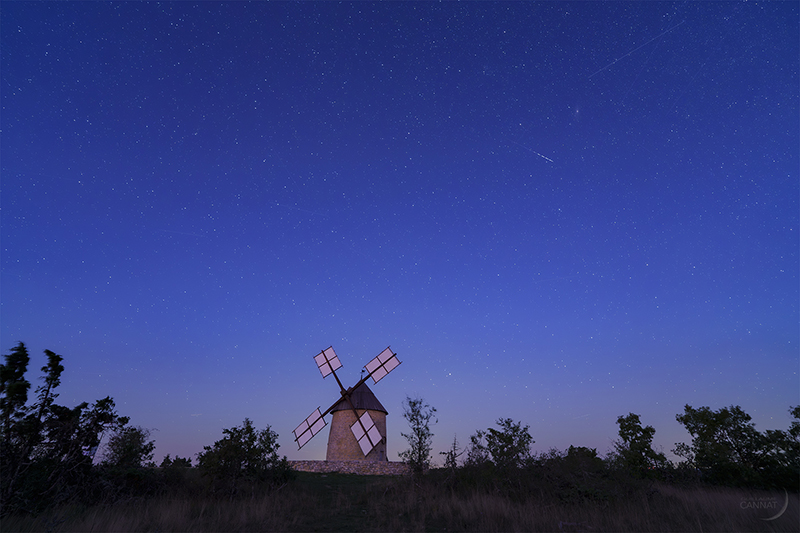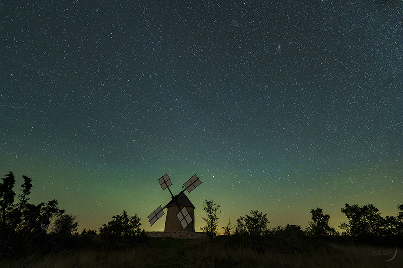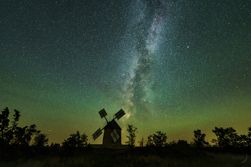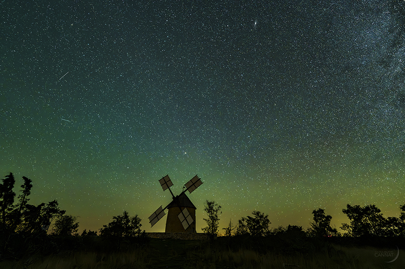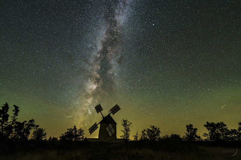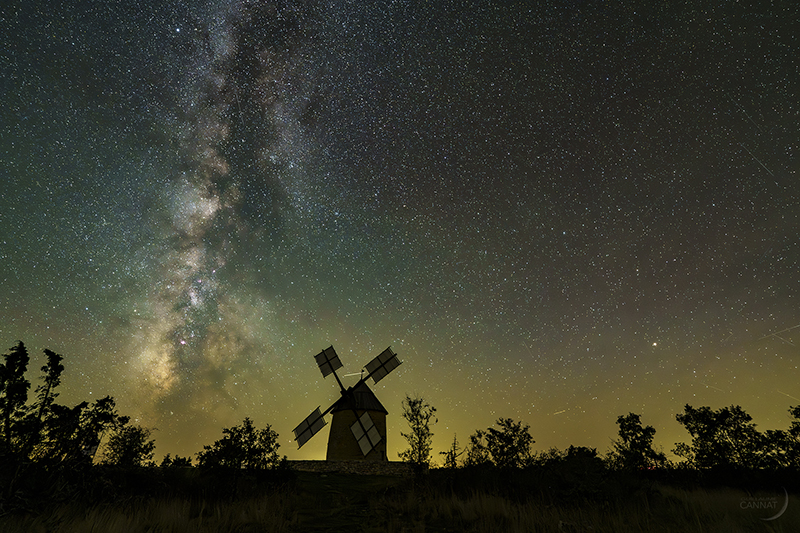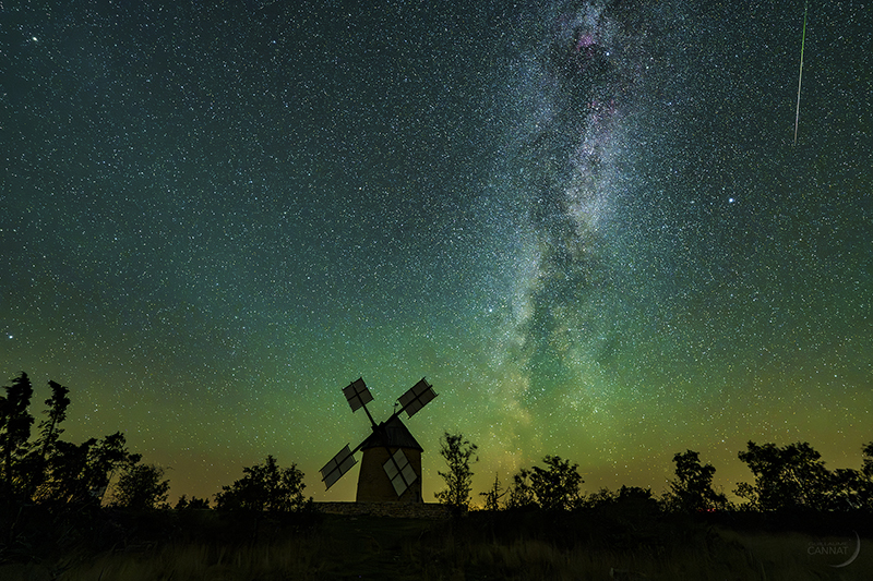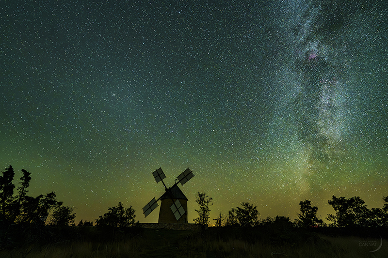 Voici une série d’images réalisées lors de cette superbe nuit de fin septembre qui montrent le déplacement de la Voie lactée entre le crépuscule et l’aube derrière le moulin de la Borie avec un très bel airglow vert émeraude, une étoile filante colorée, la tache blanchâtre du gegenshein à côté de Saturne, la clarté du croissant lunaire et l’aube. Elles sont extraites d’un time-lapse que je montrerai en avant-première au public de la conférence que je prononcerai le 6 novembre au planétarium de Planet Ocean Montpellier et que vous retrouverez en 4K sur ma chaîne YouTube peu après…